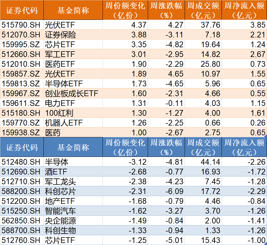 行业主题上看,光伏、证券保险相关ETF被资金看好,而半导体、酒ETF被资金抛售。