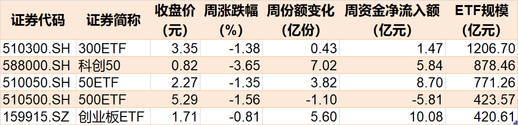 本周股指再度调整,场外资金开始小幅进场。沪深两市股票型ETF和跨境型ETF本周合计份额增加约102亿份,合计净流入约121亿元。5只主要指数ETF中,科创50ETF跌超3%,其余除创业板ETF外跌幅均超1%。