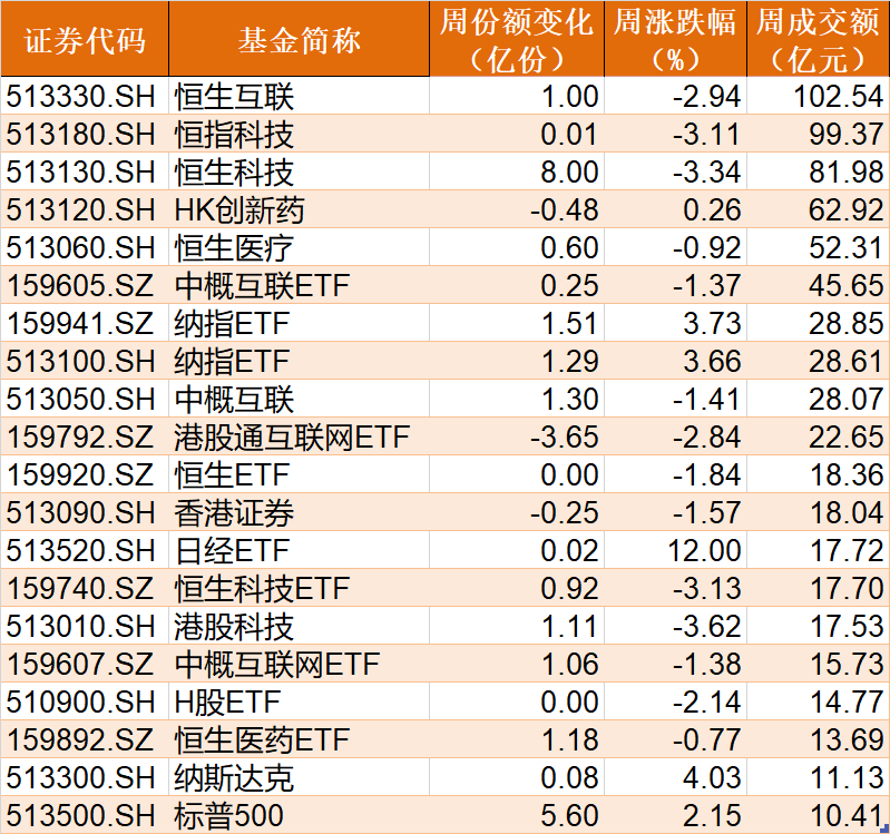 跨境ETF本周成交额超过10亿元的有20只,其中恒生互联ETF周成交额突破100亿元。从市场表现看,跨境ETF涨跌互现,其中日经ETF大涨12%、纳指ETF涨超3%,而恒生科技相关ETF则普跌3%。
