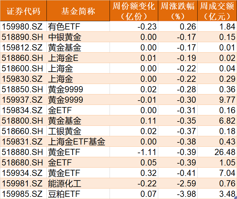 商品ETF本周涨跌互现,豆粕ETF、能源化工ETF分别下跌了3.98%、2.59%,黄金相关ETF小幅下跌,仅有色ETF实现上涨。